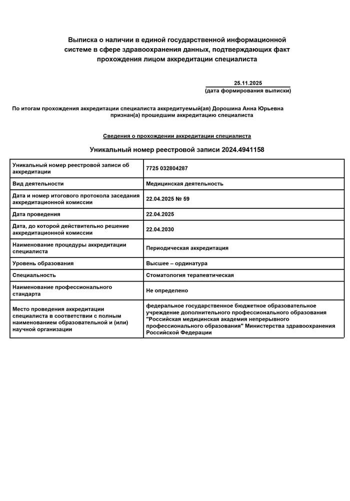 2025 г. - Повышение квалификации в Российской медицинской академии непрерывного профессионального образования по специальности «Стоматология терапевтическая».