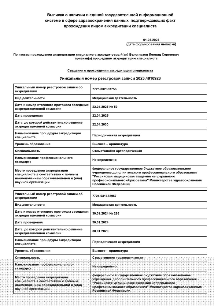 2020 г. - Повышение квалификации в центральном многопрофильном институте по специальности «Стоматология ортопедическая».