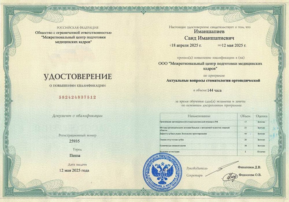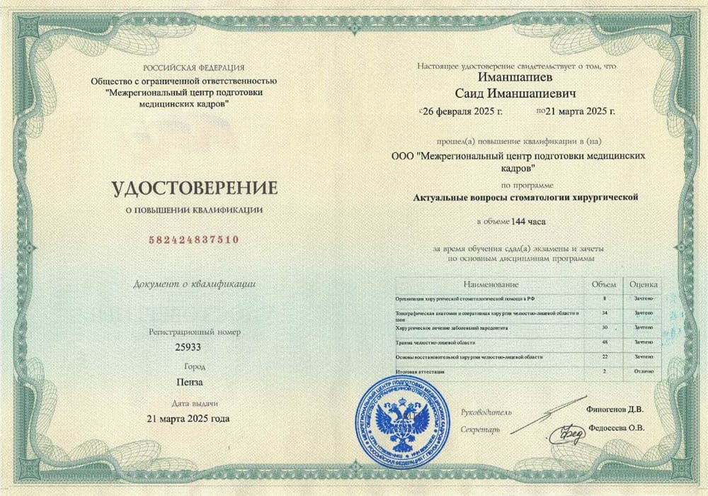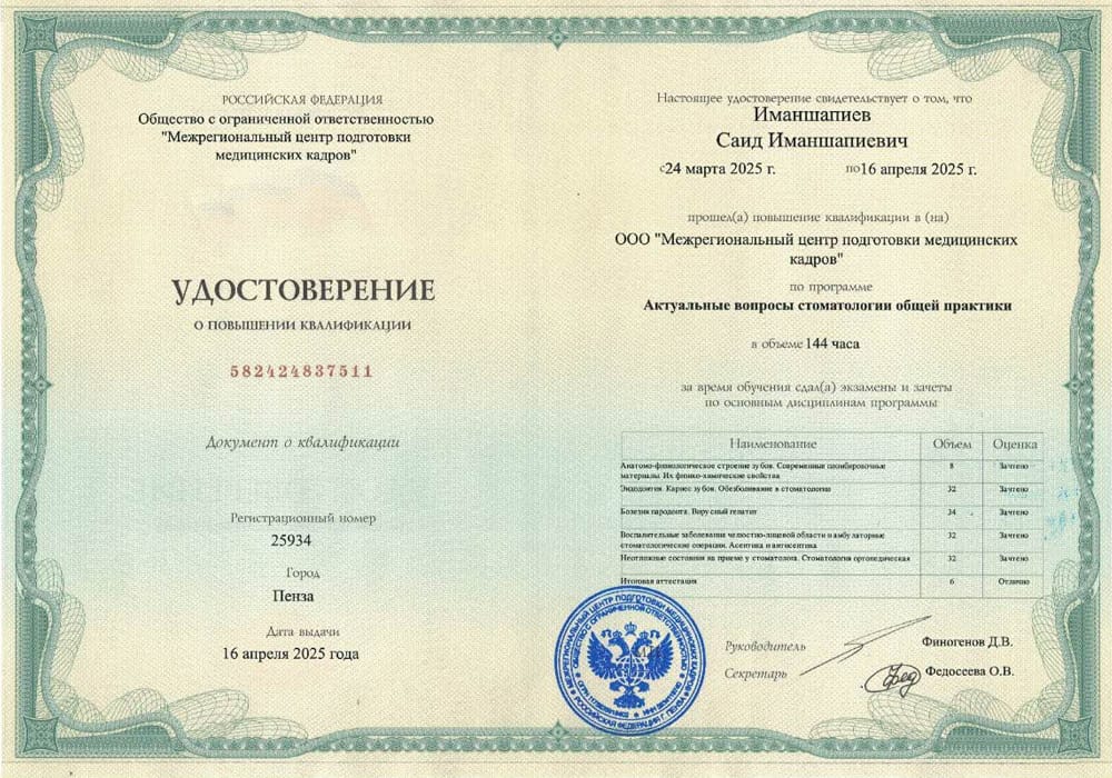 2025 г. - Повышение квалификации в Межрегиональном центре подготовки медицинских кадров по специальностям «Стоматология ортопедическая», «Стоматология хирургическая» и «Стоматология общей практики».