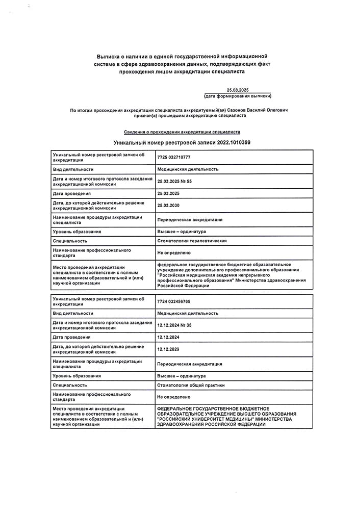2025 г. - Повышение квалификации в Российской медицинской академии непрерывного профессионального образования по специальности «Стоматология терапевтическая» .