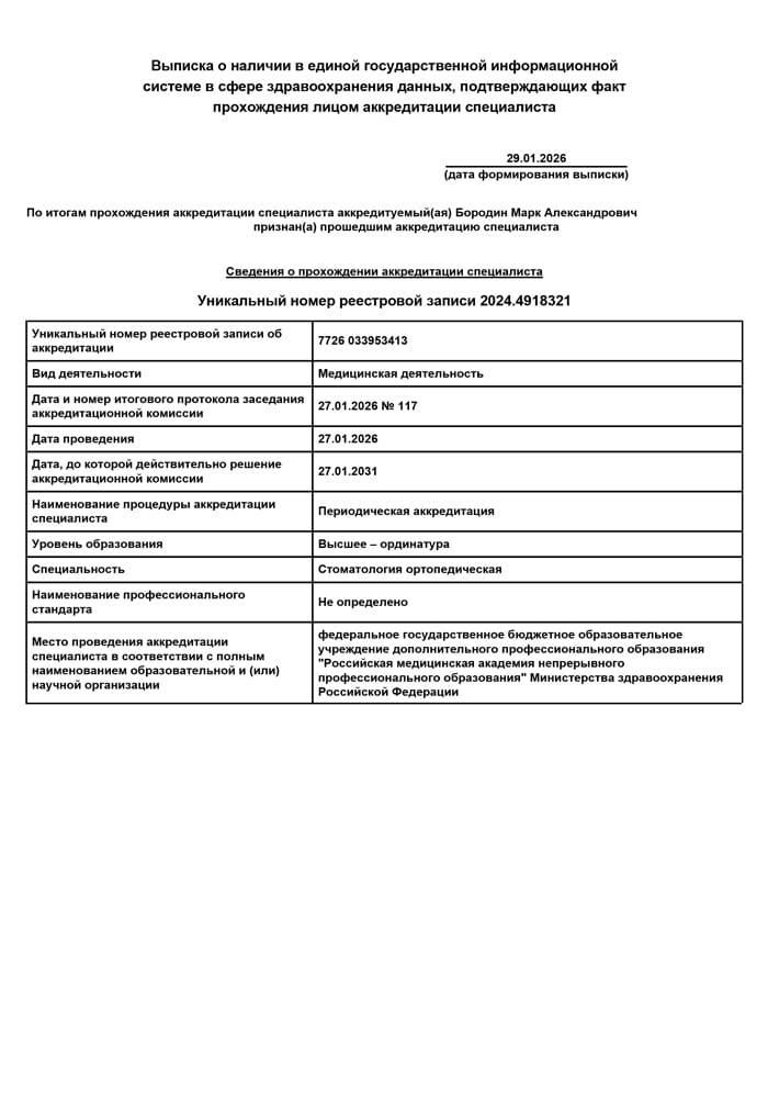2026 г. - Повышение квалификации в Российской медицинской академии непрерывного профессионального образования по специальности «Стоматология ортопедическая»