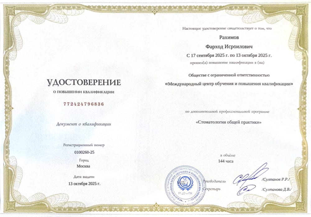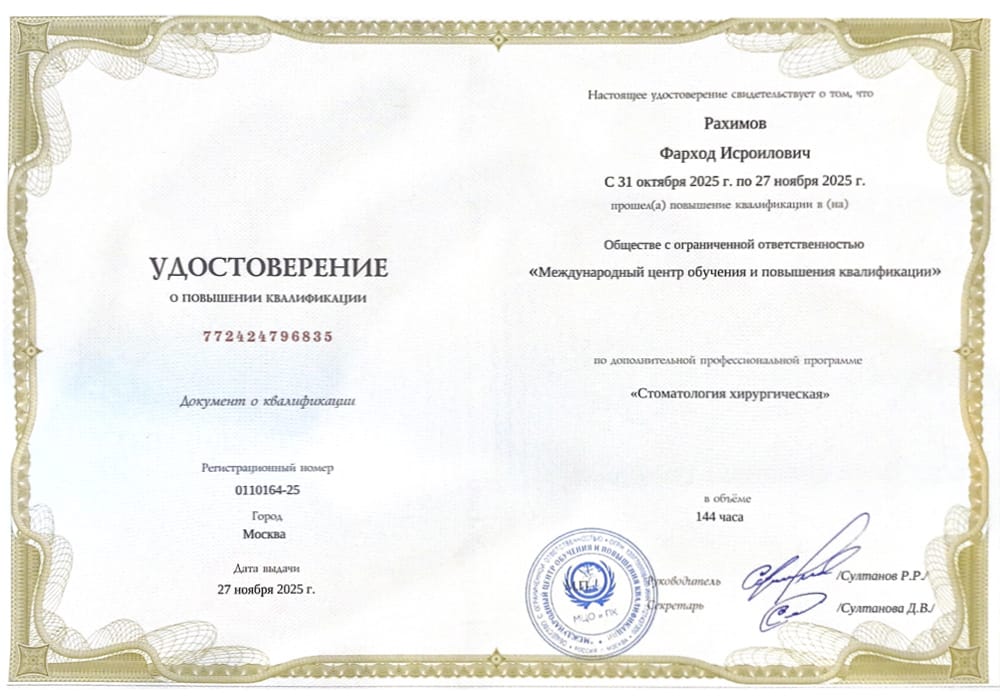 2020 г. - Ординатура в Центральной государственной медицинской академии Управления делами Президента Российской Федерации по специальности «Стоматология хирургическая».