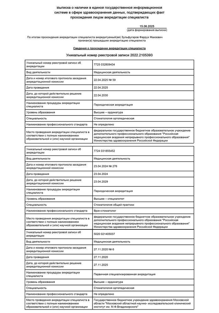 2025 г. - Повышение квалификации в Российской медицинской академии непрерывного профессионального образования по специальности «Стоматология ортопедическая».