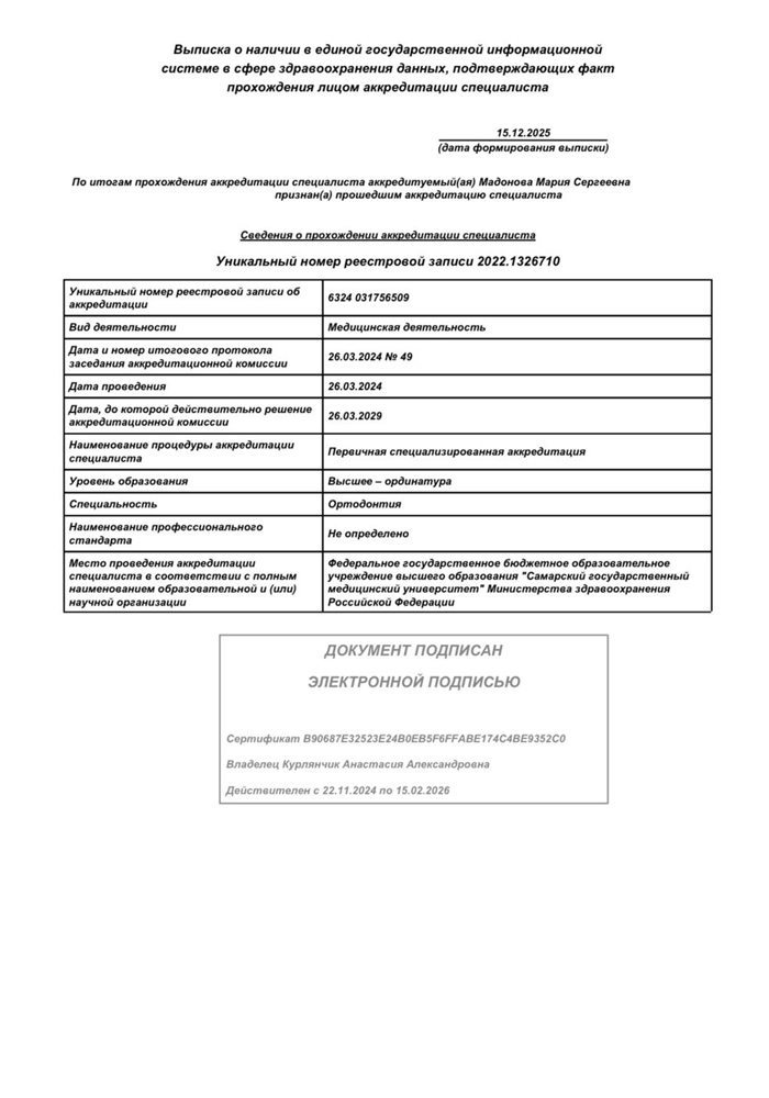 2020 г. - Ординатура в ЦНИИС и ЧЛХ по специальности «Ортодонтия».