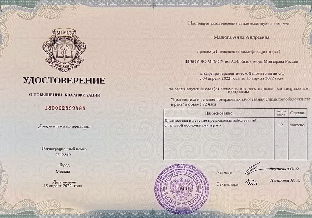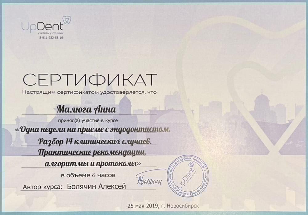2021 г. - Ординатура на Кафедре хирургической стоматологии, стоматологической имплантации и челюстно-лицевой хирургии Новосибирского государственного медицинского университета по специальности «Стоматология хирургическая».
