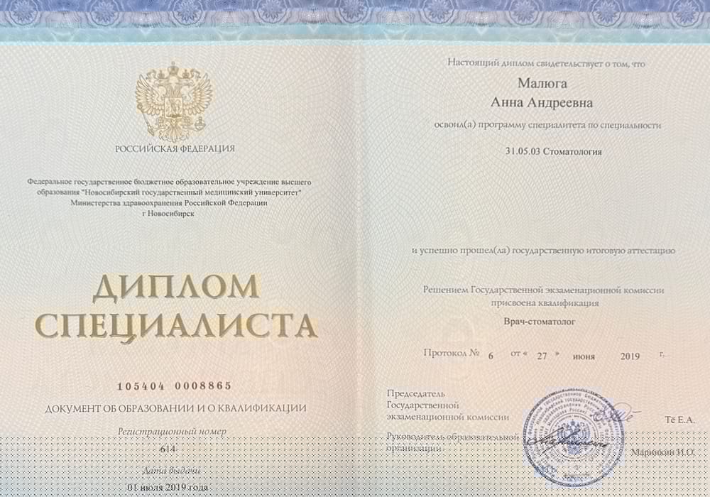 2019 г. - Окончила Новосибирский государственный медицинский университет по специальности «Стоматология».