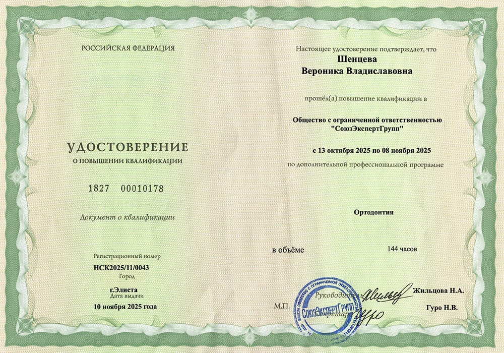 2025 г. - Повышение квалификации в СоюзЭкспертГрупп по специальности «Ортодонтия».