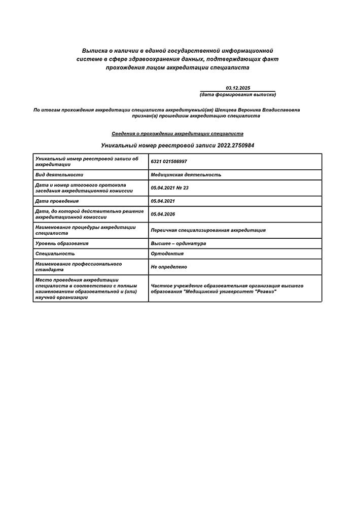 2020 г. - Ординатура при Медицинском университете «Реавиз» по специальности «Ортодонтия».