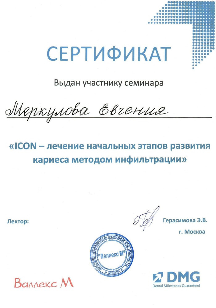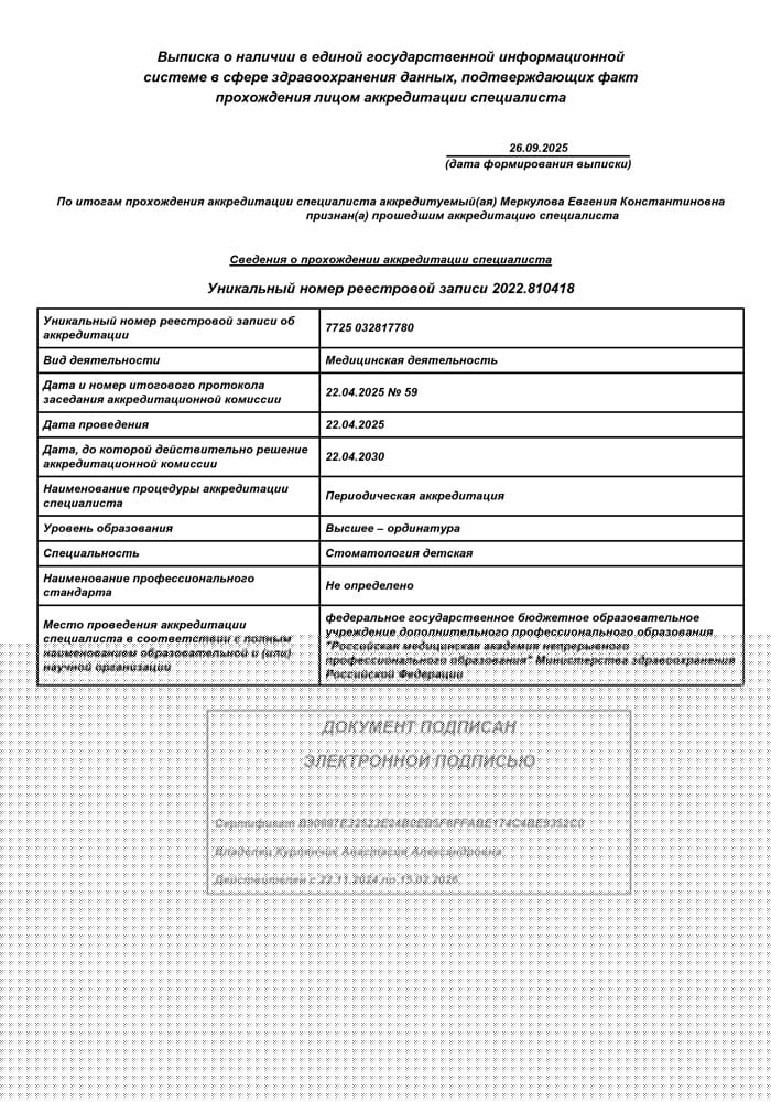 2020 г. - Повышение квалификации в Центральном многопрофильном институте по специальности «Стоматология детская».