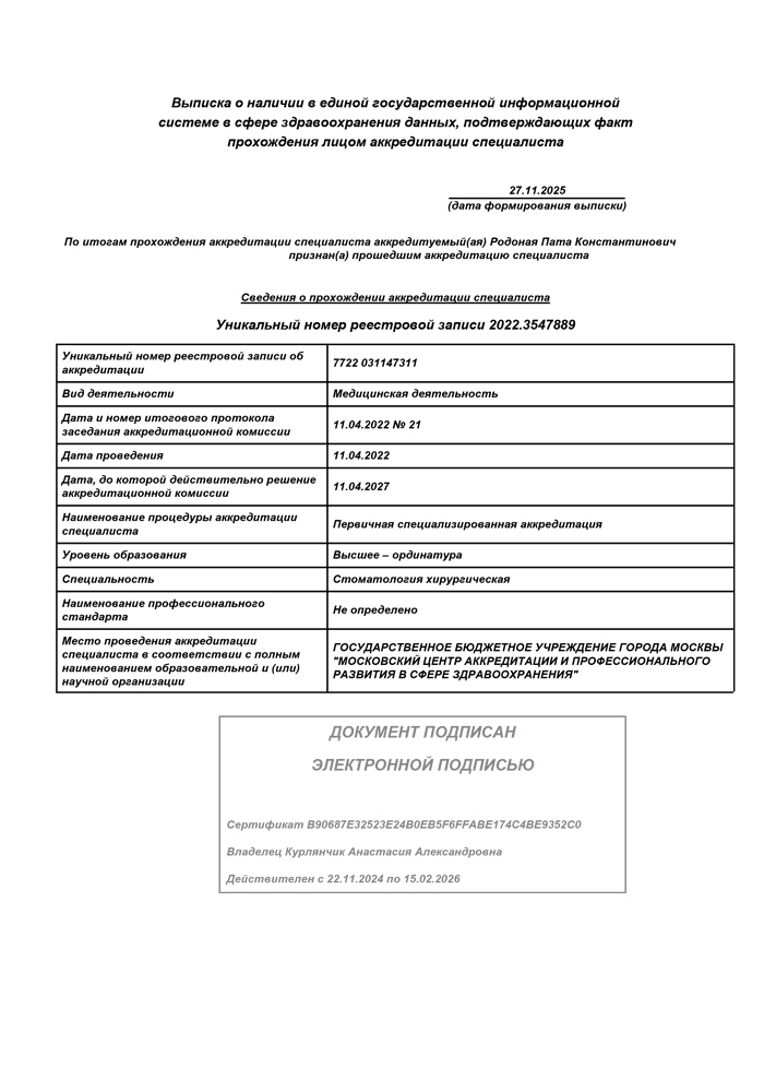 2020- Федеральное государственное бюджетное учреждение Федеральный научно-клинический центр специализированных видов медицинской помощи и медицинских технологий (ФГБУ ФНКЦ ФМБА России). Квалификация Врач стоматолог-хирург, Москва