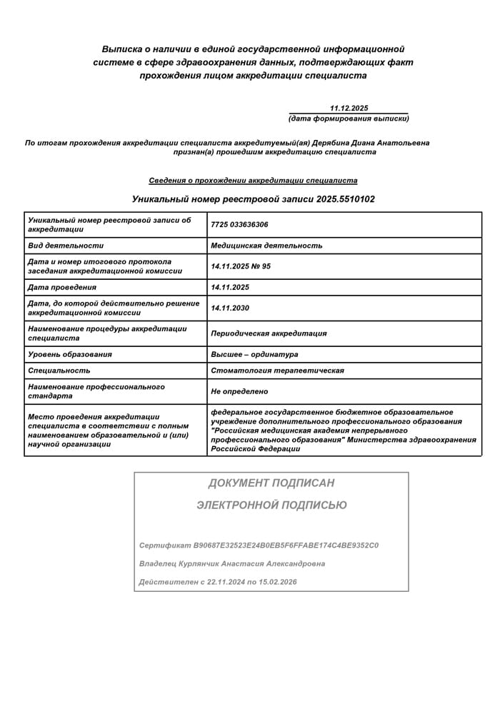 2025 г. - Повышение квалификации в Российской медицинской академии непрерывного профессионального образования по специальности «Стоматология терапевтическая»