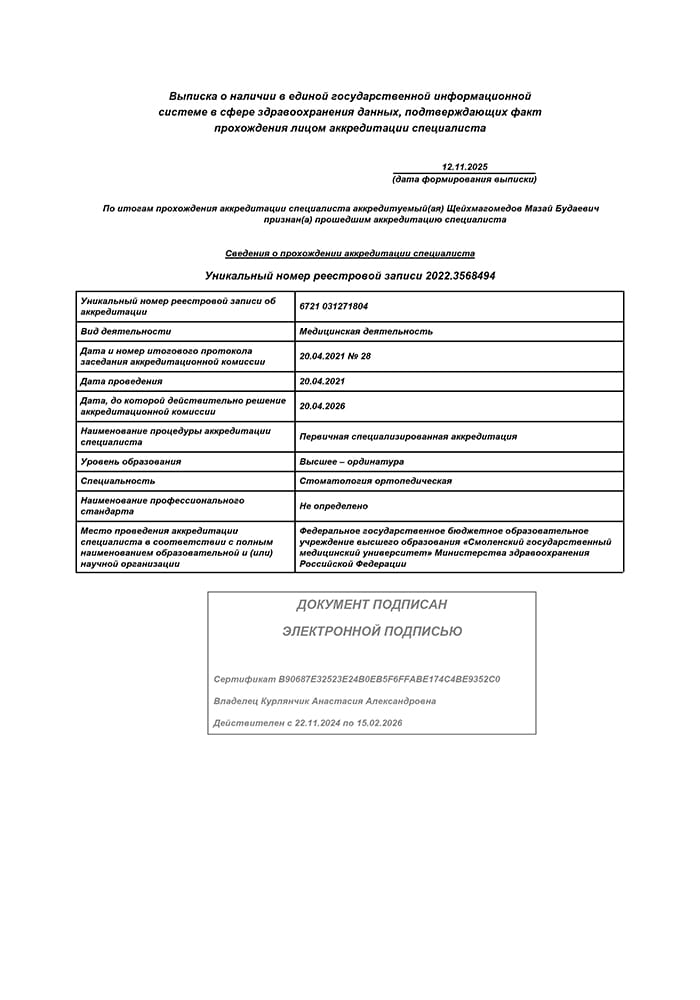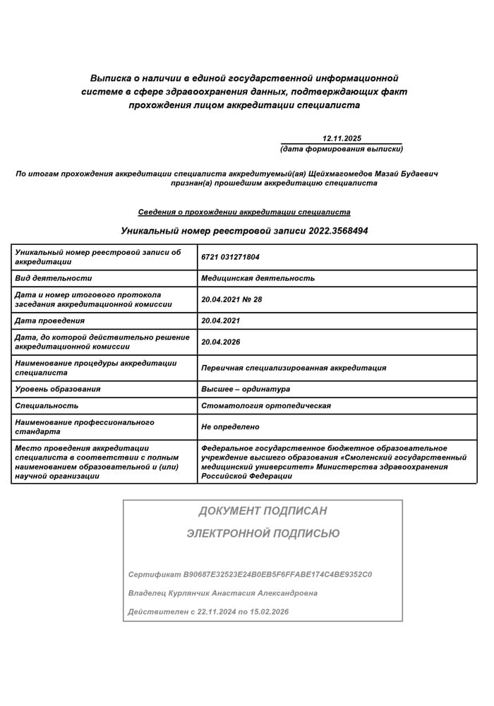 2020 г. - Ординатура в Смоленском государственном медицинском университете по специальности «Стоматология ортопедическая».