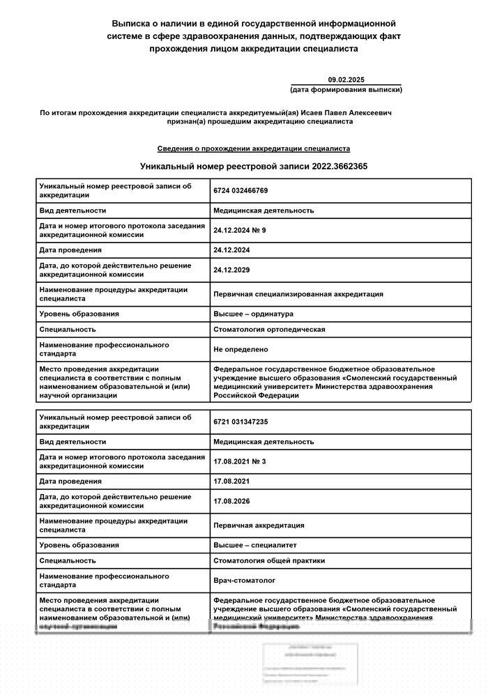 2024 г. - Ординатура в Смоленском государственном медицинском университете по специальности «Стоматология ортопедическая».