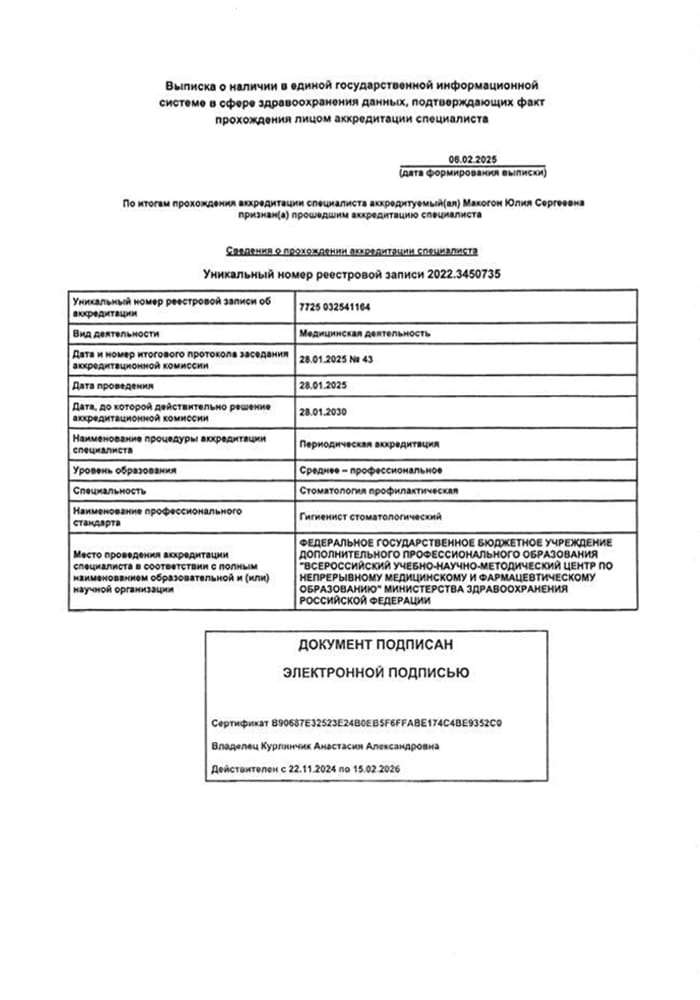 2016 г. - Профессиональная переподготовка в Стоматологическом колледже №1 г. Москва по специальности «Стоматология профилактическая».