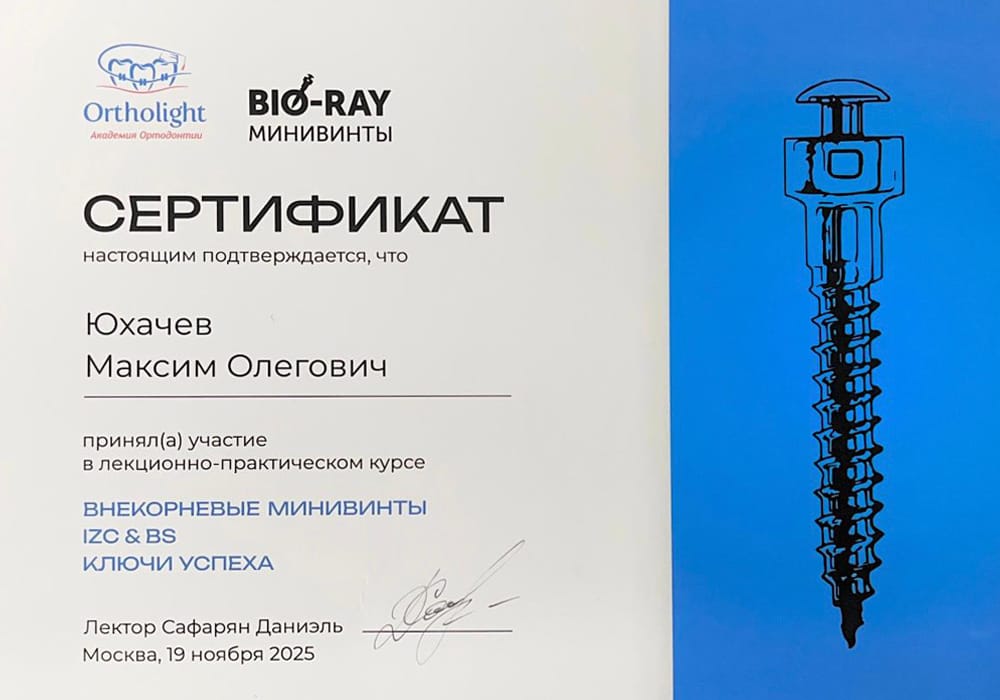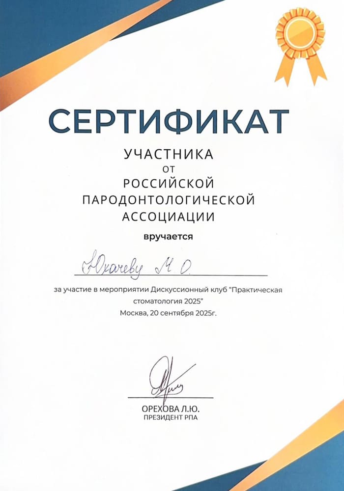 2020 г. – Окончил Факультет непрерывного медицинского образования Медицинского института РУДН по программе дополнительного профессионального образования «Стоматология профилактическая».