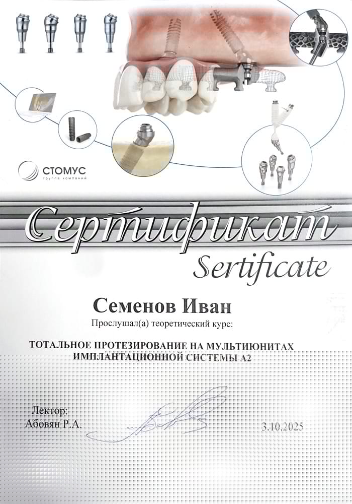 2025 г. - Ординатура в Национальном НИИ общественного здоровья имени Н.А. Семашко по специальности «Стоматология ортопедическая».