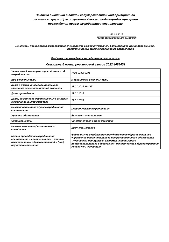 2026 г. - Повышение квалификации в Российской медицинской академии непрерывного профессионального образования по специальности «Стоматология общей практики».