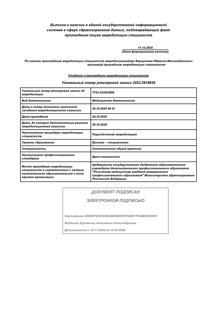 2025 г. - Повышение квалификации в Российской медицинской академии непрерывного профессионального образования по специальности "Стоматология общей практики"