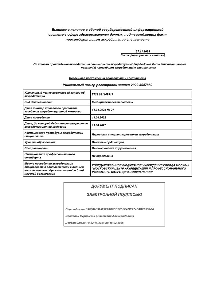 2020- Федеральное государственное бюджетное учреждение Федеральный научно-клинический центр специализированных видов медицинской помощи и медицинских технологий (ФГБУ ФНКЦ ФМБА России). Квалификация Врач стоматолог-хирург, Москва