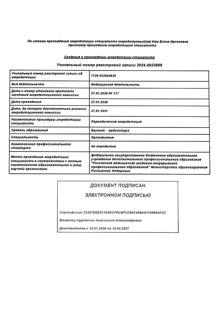 2026 г. - Повышение квалификации в Российской медицинской академии непрерывного профессионального образования по специальности «Ортодонтия».
