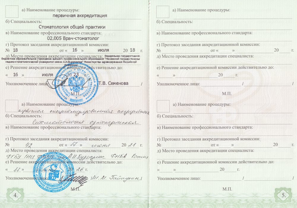 2020 г. – Ординатура в Федеральном медицинском биофизическом центре им. А.И Бурназяна по специальности «Стоматология ортопедическая».