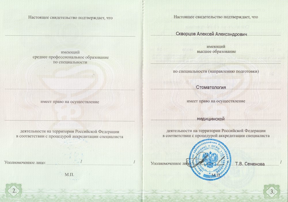 2018 г. – Окончил Московский государственный медико-стоматологический университет им. А.И. Евдокимова по специальности «Стоматология».