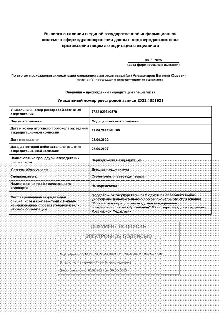 2022 г. - Повышение квалификации в Российской медицинской академии непрерывного профессионального образования по специальности «Стоматология ортопедическая».