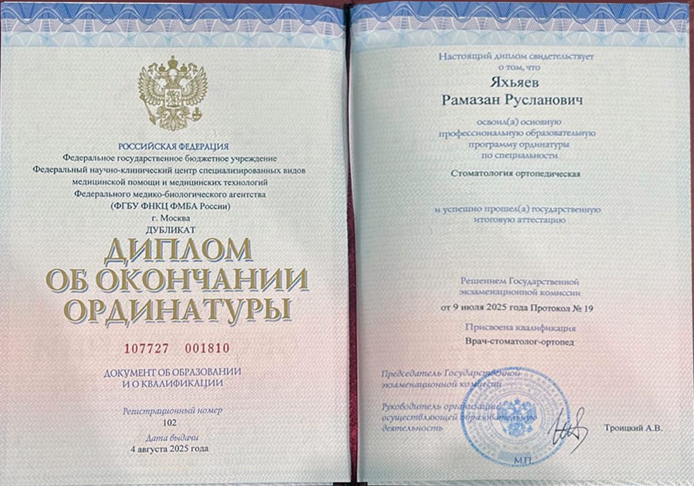 2025 г.- Академия Постдипломного Образования ФНКЦ ФМБА России по специальности «стоматология ортопедическая»
