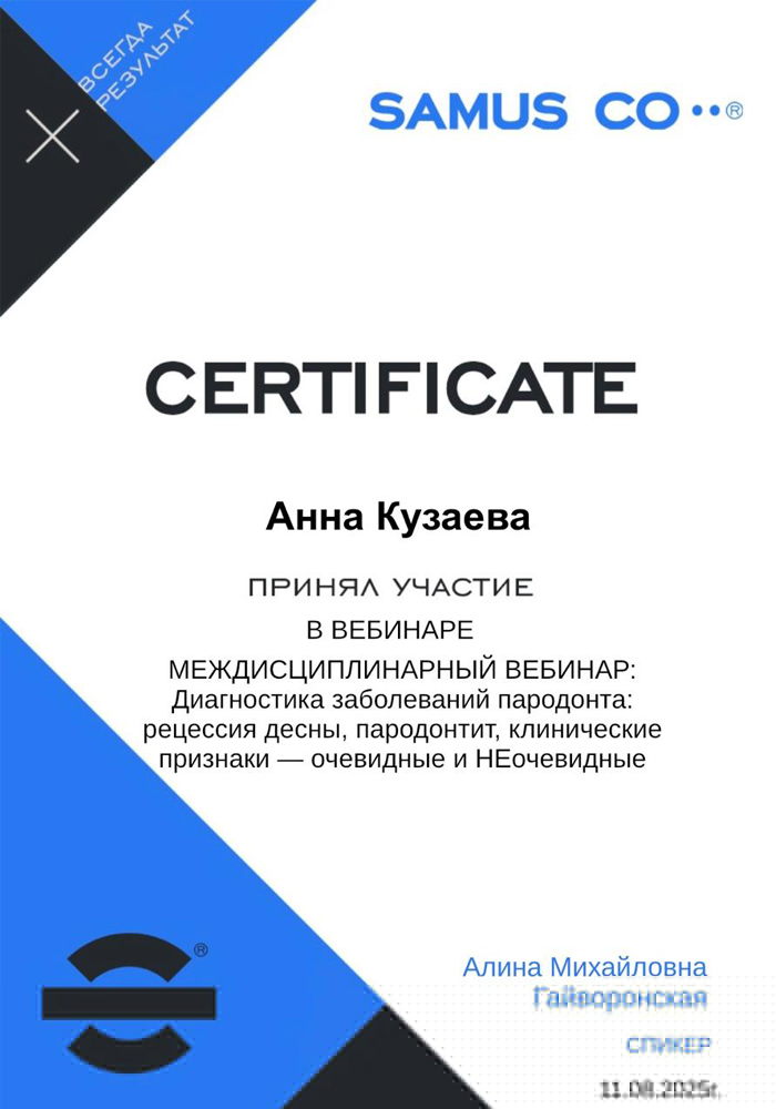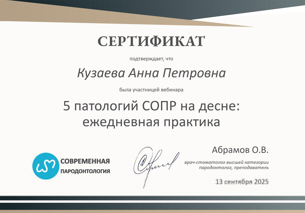 2020 г. – Повышение квалификации в Учебном Центре «Простые решения» по специальности «Стоматология ортопедическая».