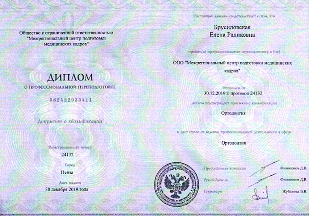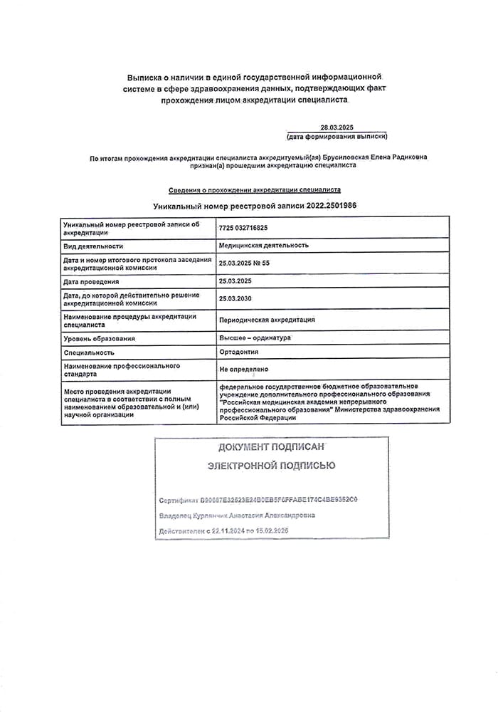2025 г. - Повышение квалификации в Российской медицинской академии непрерывного профессионального образования по специальности «Ортодонтия».