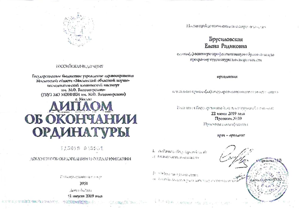 - Образовательное учреждение "Московский областной научно-исследовательский клинический институт им. М.Ф. Владимирского 2023 г. - врач-ортодонт