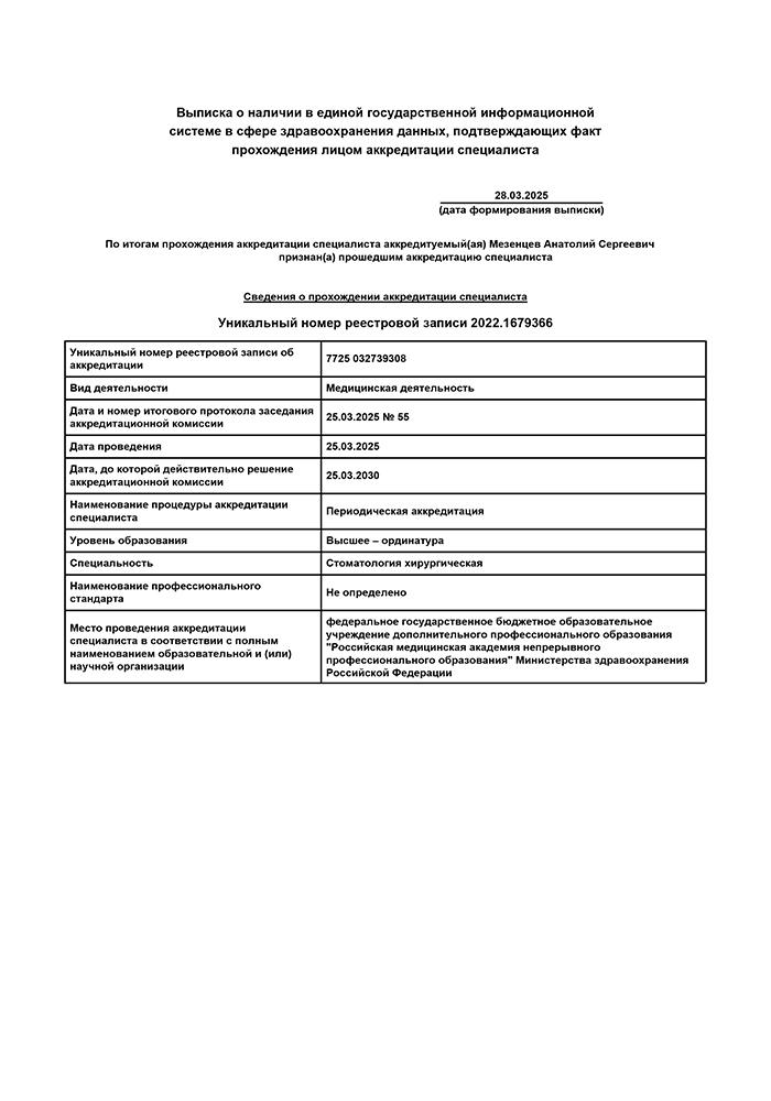2020 г. - повышение квалификации в Московском государственном медико-стоматологическом университете по специальности «Стоматология хирургическая».