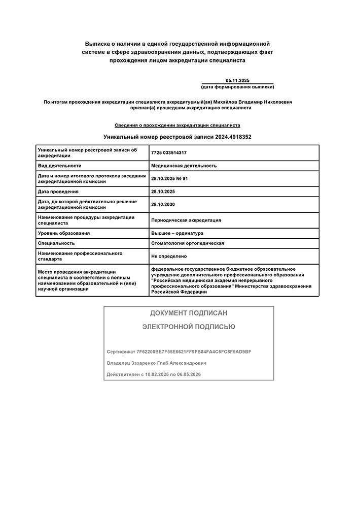 2025 г. - Повышение квалификации в Российской медицинской академии непрерывного профессионального образования по специальности «Стоматология ортопедическая».