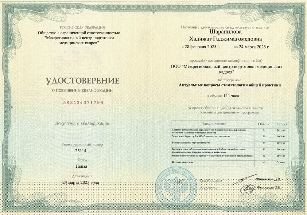 2025 г. - Повышение квалификации в Межрегиональном центре подготовки медицинских кадров по программе "Актуальные вопросы стоматологии общей практики"