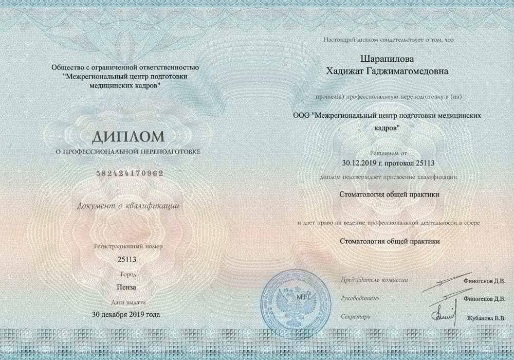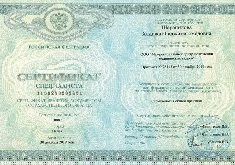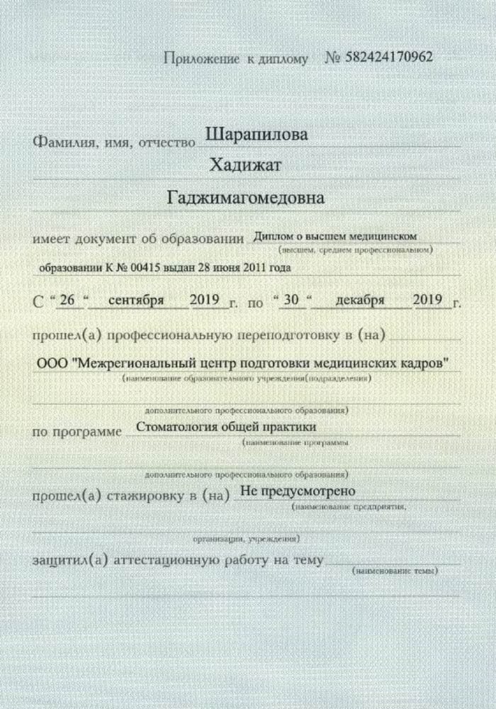 2019 г.- Повышение квалификации в Межрегиональном центре подготовки медицинских кадров по специальности "Стоматология общей практики"