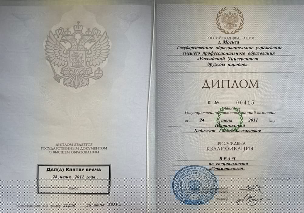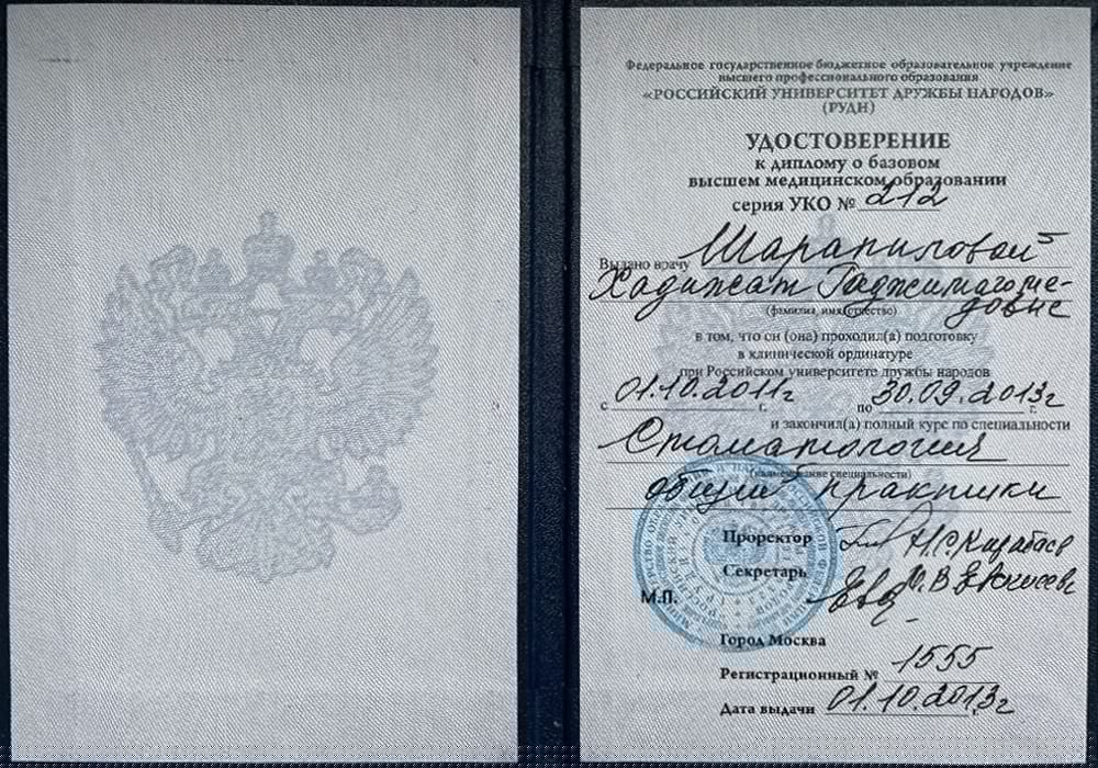 2013 г.- Ординатура в Российском университете дружбы народов по специальности "Стоматология общей практики”.