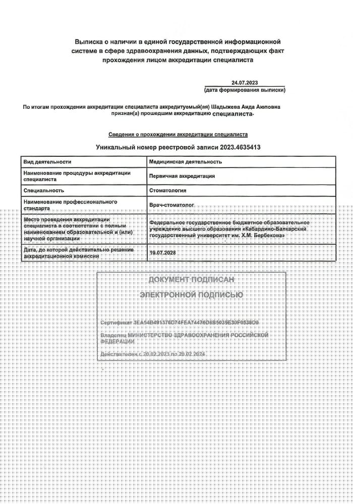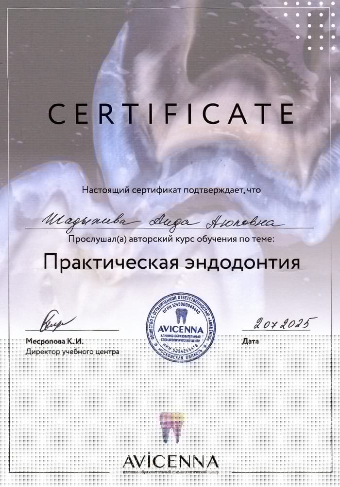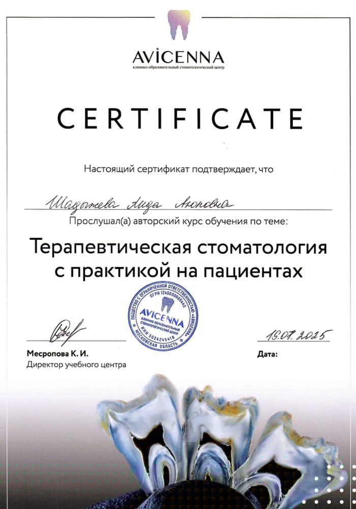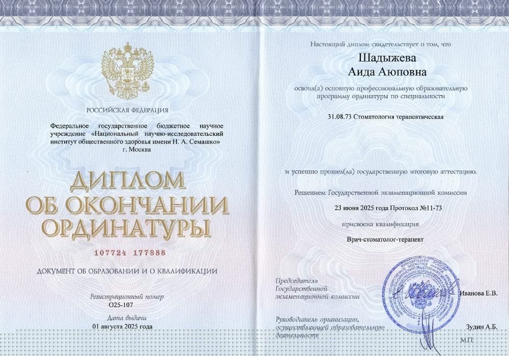 2025 г.- ординатура в ФГБНУ «Национальный НИИ общественного здоровья имени Н.А. Семашко» по специальности «Стоматология терапевтическая»
