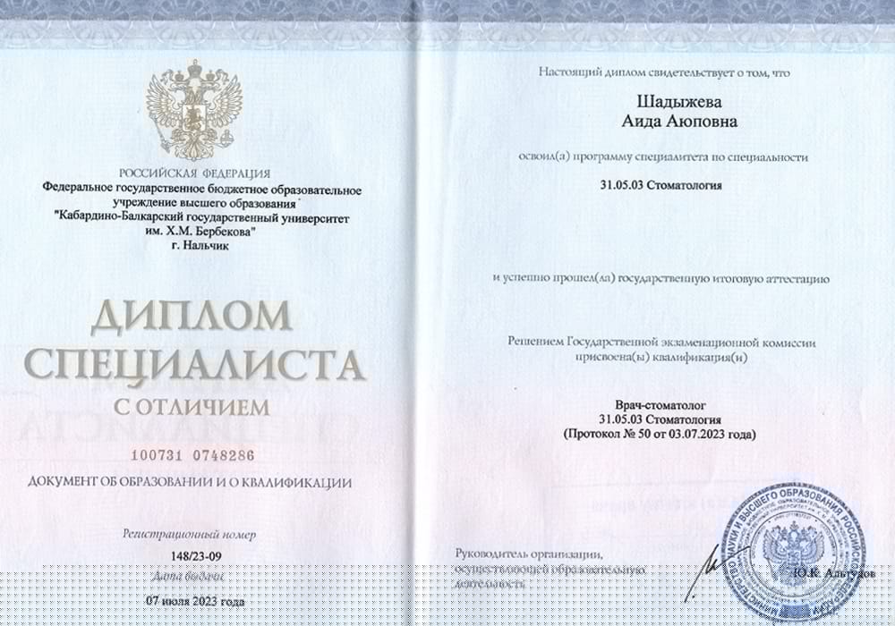 2023 г.- окончила Кабардино-Балкарский государственный университет им. Х.М. Бербекова по специальности «Стоматология».