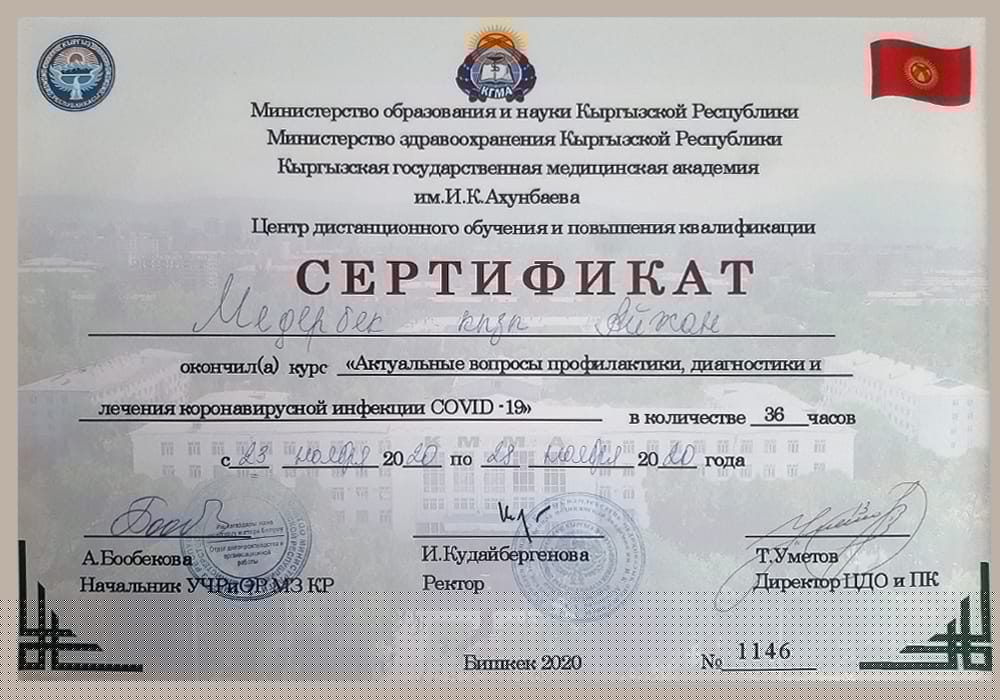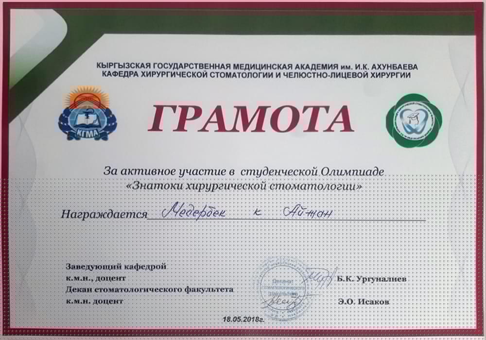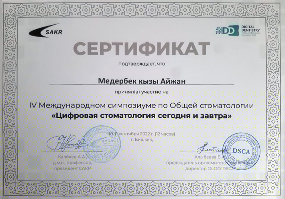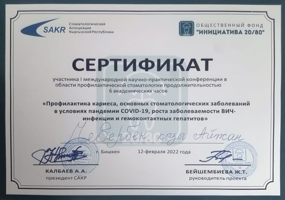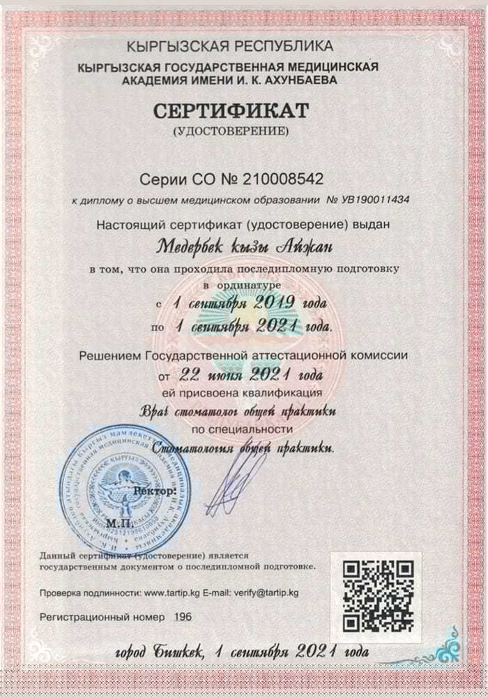 2021 г.- Ординатура в Кыргызской государственноймедицинской академии имени И.К. Ахунбаева, по специальности врач-стоматолог общей практики.