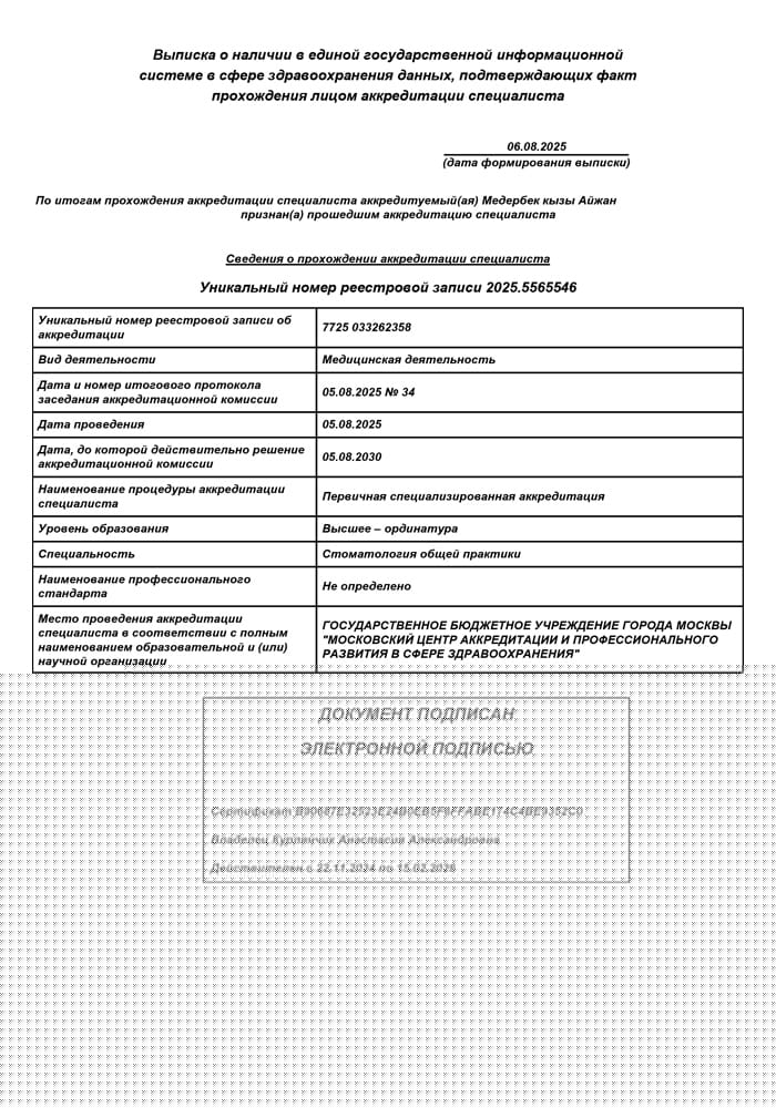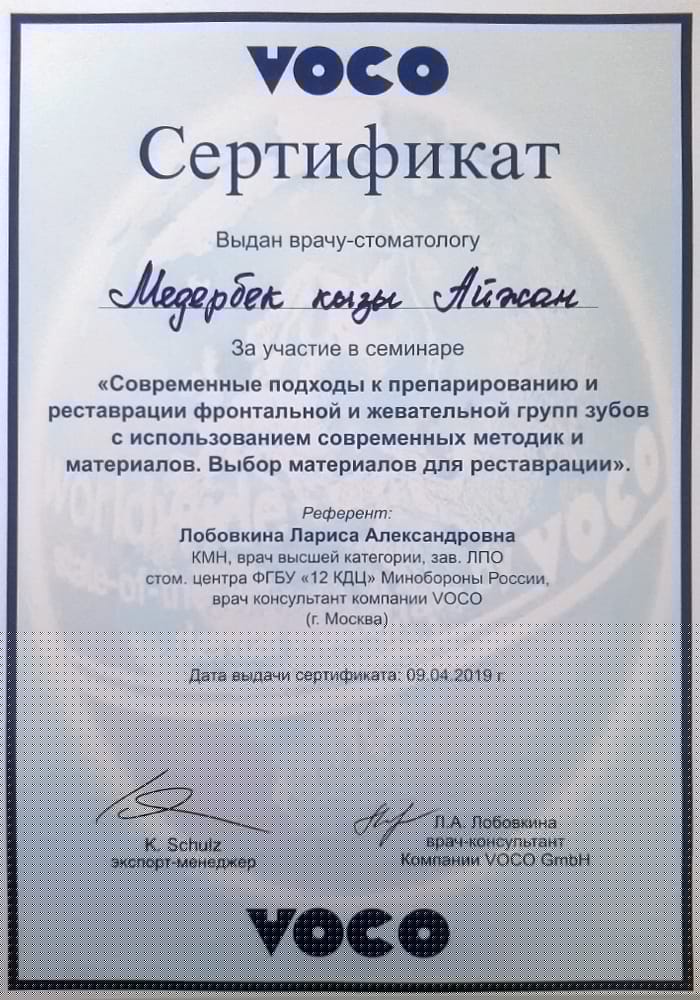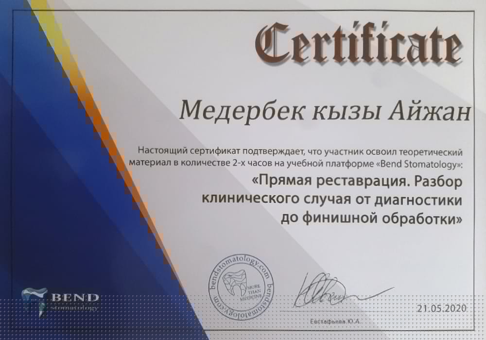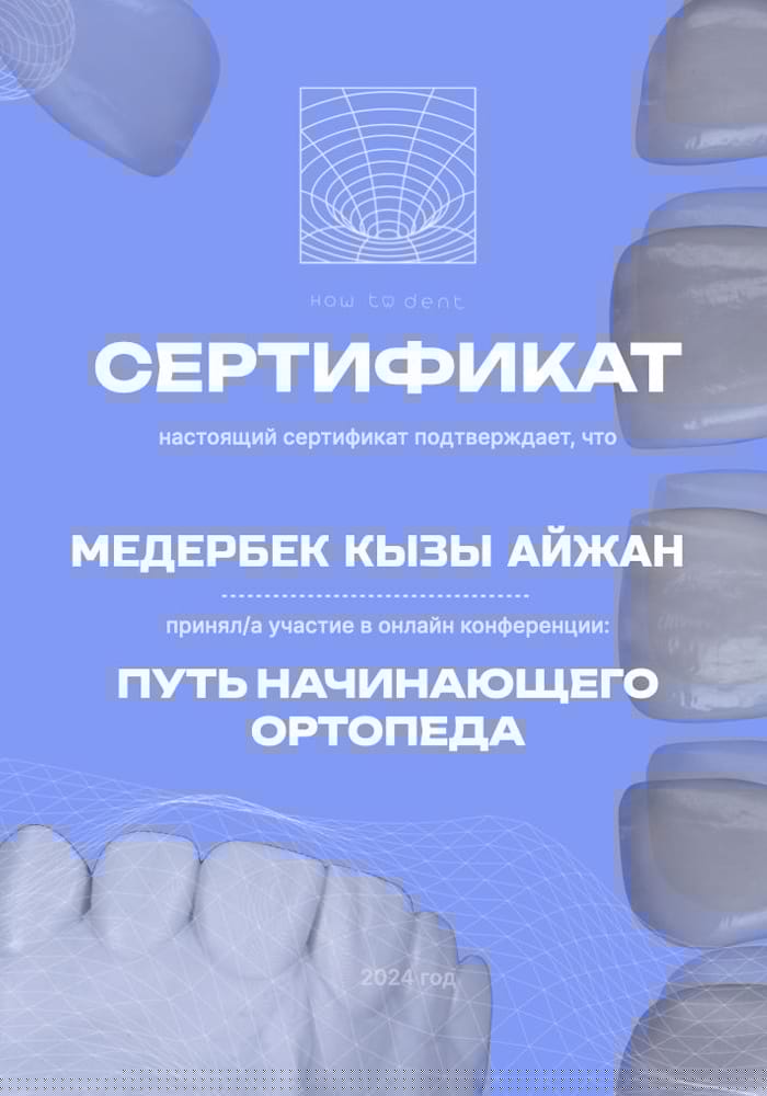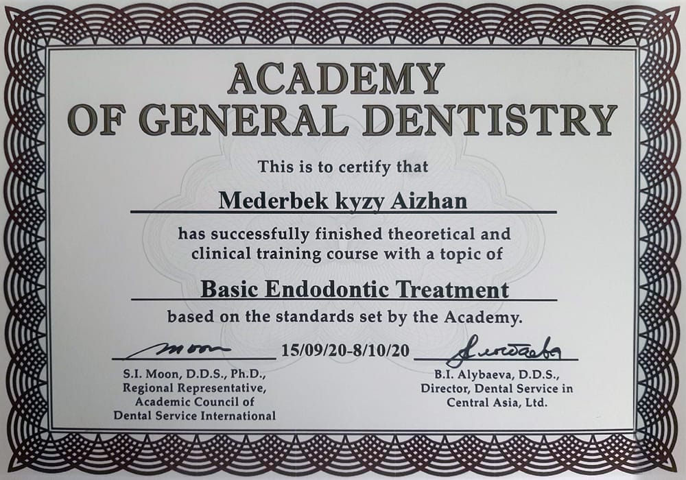 2021 г.- Ординатура в Кыргызской государственноймедицинской академии имени И.К. Ахунбаева, по специальности врач-стоматолог общей практики.