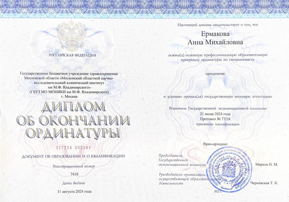2024 г. - Ординатура в Московском областном исследовательском клиническом институте им.М.Ф.Владимирского по специальности «Ортодонтия».