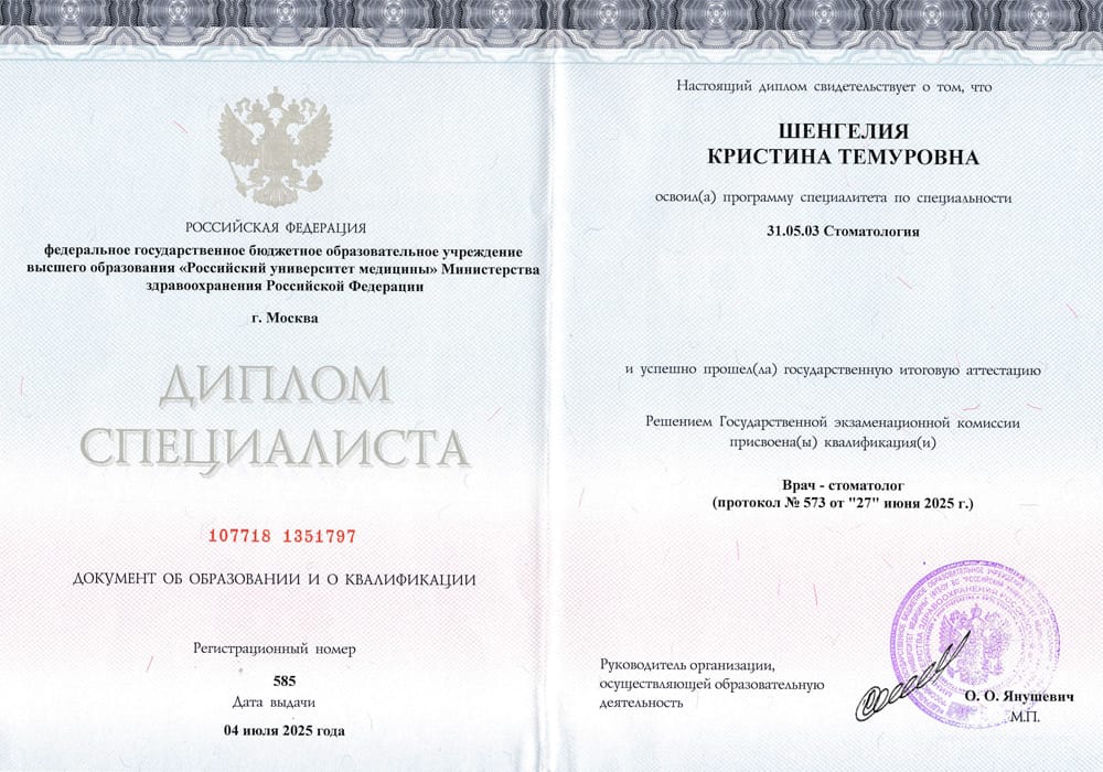 2025 г.- ФГБУ ВО «Российский Университет Медицины» МИНЗДРАВА РФ (бывш. МГМСУ им. А. И. Евдокимова), «Стоматология», Москва