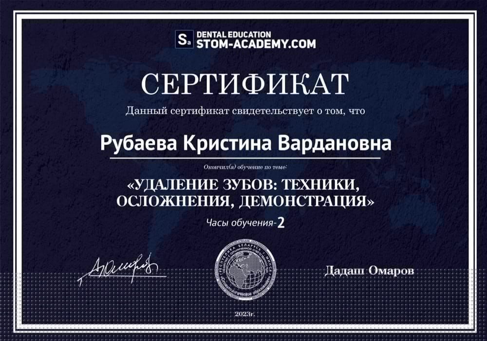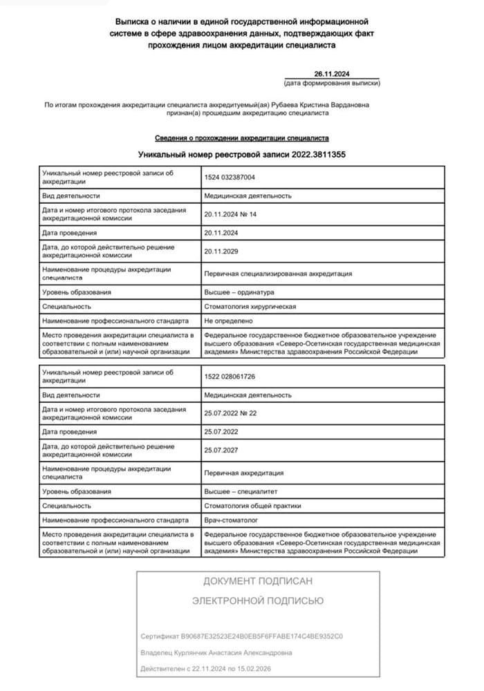 2024 г. - Ординатура в Северо-Осетинской государственной медицинской академии по специальности «Стоматология хирургическая».