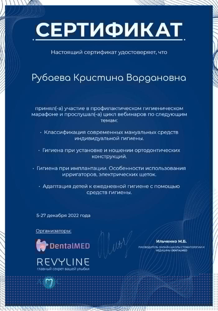 2022 г.- Участник марафона по профилактической гигиены «Классификация современных мануальных средств индивидуальной гигиены. Гигиена при установке и ношении ортодонтических конструкций. Гигиена при имплантации. Особенности использования ирригаторов, электрических щеток. Адаптация детей к ежедневной гигиене с помощью средств гигиены», г. Москва