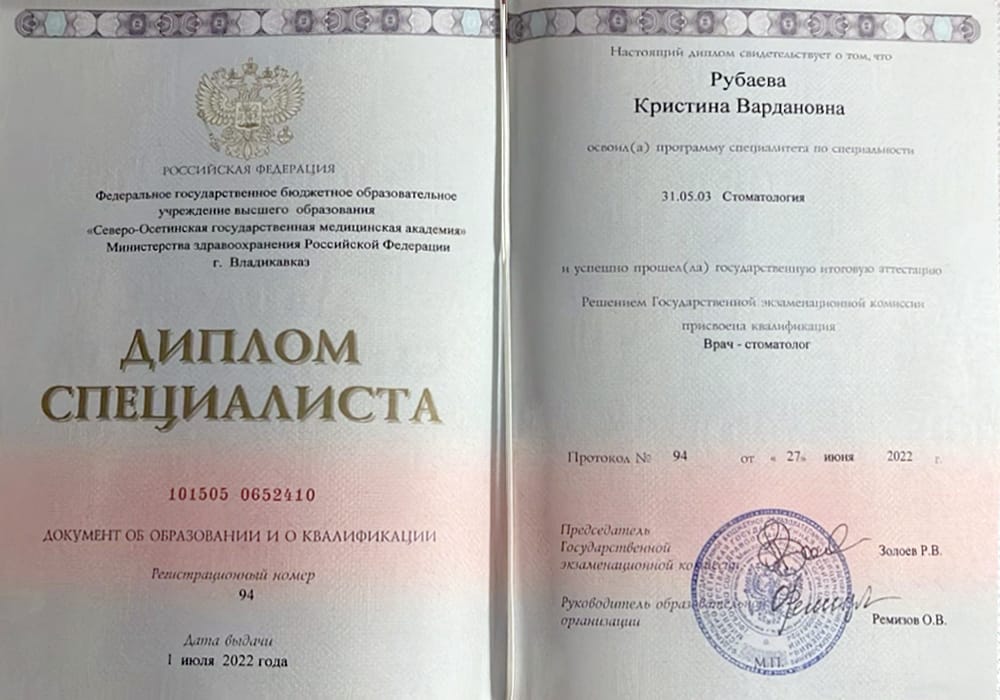 2022 г. - Окончила Северо-Осетинскую государственную медицинскую академию по специальности «Стоматология».