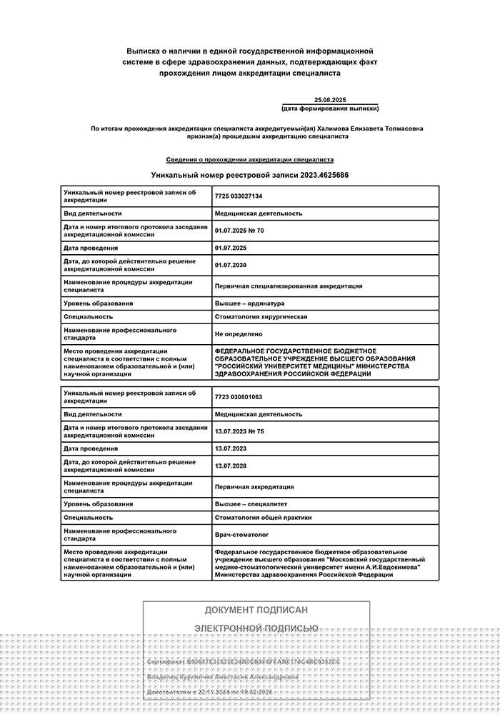 2023 г. - Окончила Московский государственный медико-стоматологический университет им. А.И. Евдокимова по специальности «Стоматология».