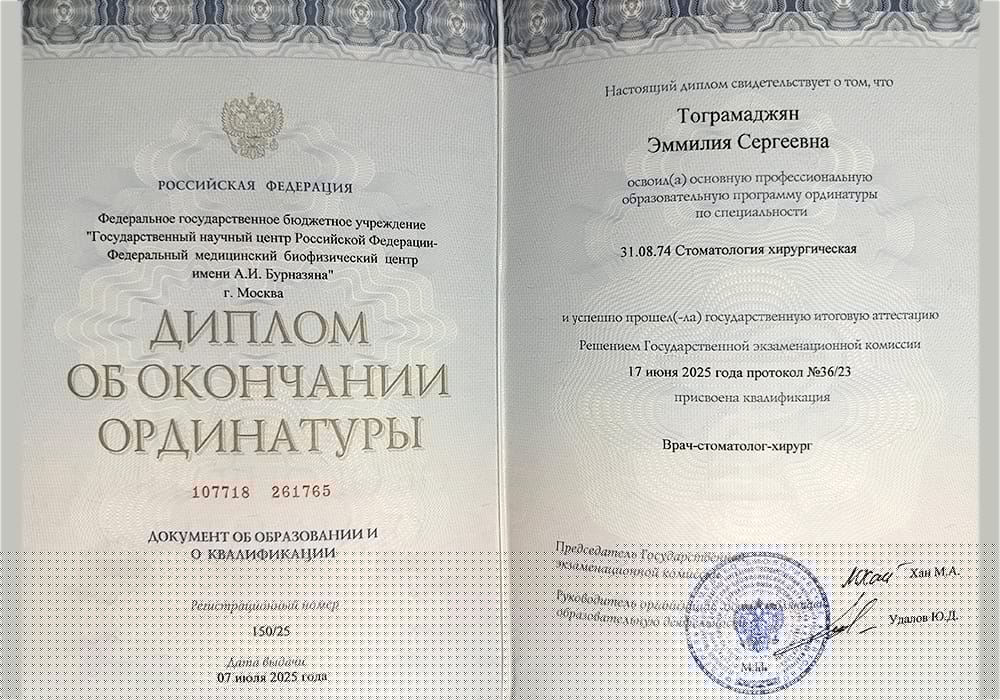 2025 г.- окончила Медико-биологический университет инноваций и непрерывного образования ФМБЦ им. А.И. Бурназяна ФМБА России по направлению «стоматология хирургическая»