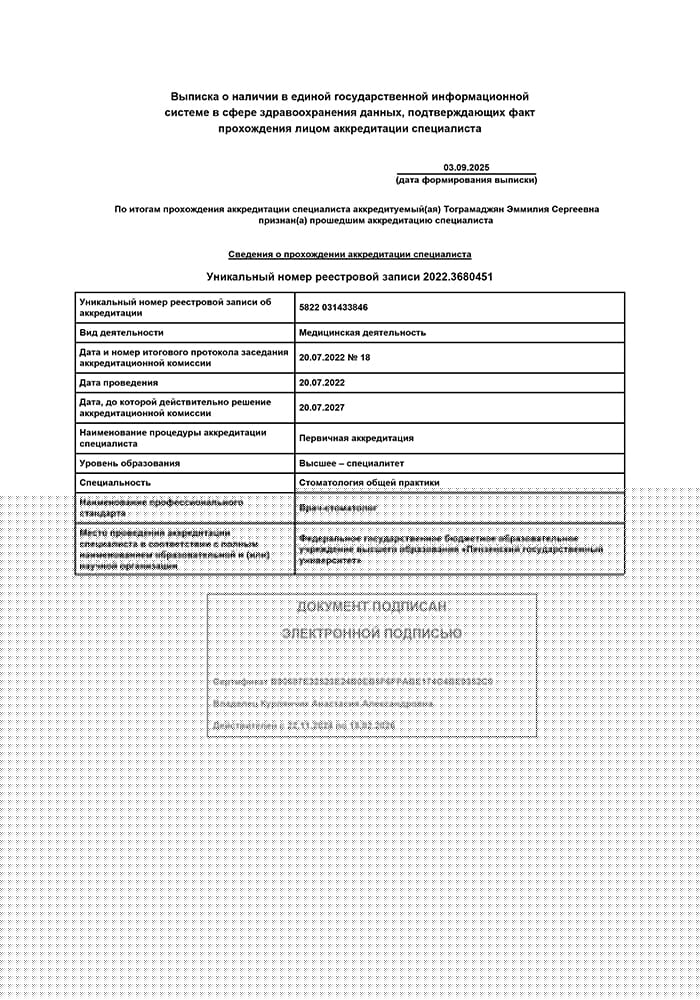 Действующая аккредитация врача-стоматолога общей практики от 2022 года