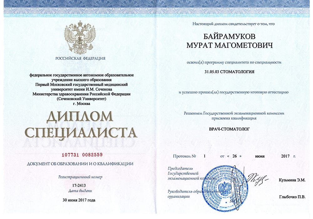 2017 г.- Окончил Первый Московский государственный университет им И.М. Сеченова по специальности «Стоматология»