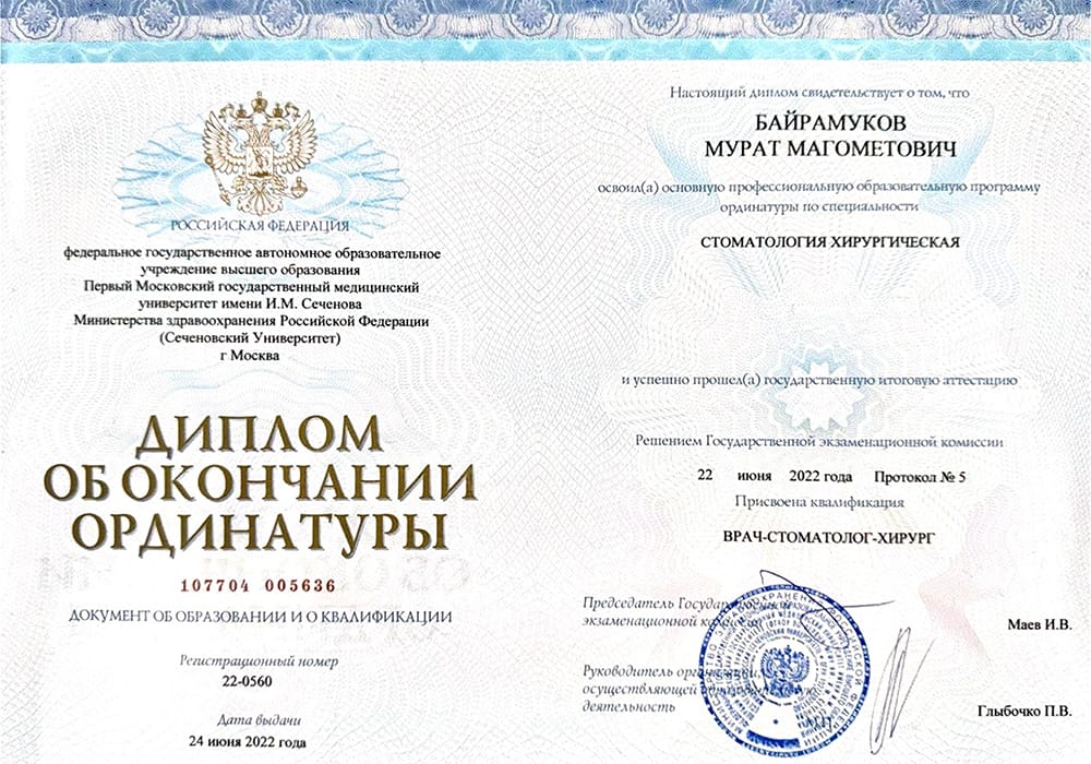 2022 г.- Окончил Первый Московский государственный университет им И.М. Сеченова по специальности «Хирургическая стоматология»